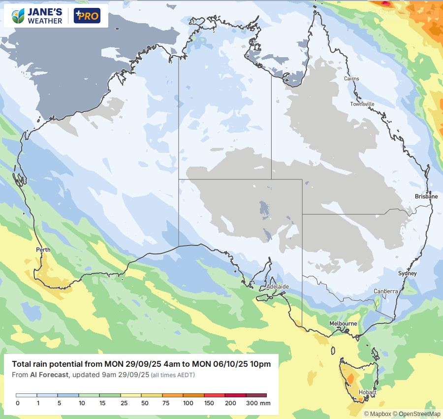 The wandering low crossing nearest to Tasmania means plenty of rain for the apple isle (heaviest in the west). It also means good falls for southeast SA, as well as southwest VIC and western Gippsland (VIC).